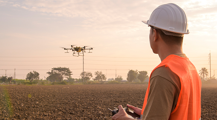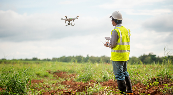 Drone land surveying, uses drones equipped with cameras and sensors to capture data for creating maps and 3D models of land areas.